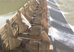 翻板壩阻水,經不住洪水的沖擊,易被漂浮物卡塞或上游淤積造成不能自動翻板,容易被洪水沖壞壩體影響防洪安全。洪水過后翻板門再關上時被異物卡住,造成大量漏水,一旦淤積厚度較大或泥沙板結,閘門就不能正常回門(眾多閘門中只要有一扇),將影響河道正常蓄水。汛期漂浮物(特別是樹枝)經常卡住閘門導致起翻或回落困難,威脅到行洪安全。